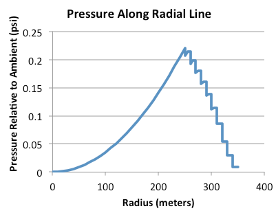 Next, let's look at the profile as you increase radius from the center-line in the center of the tube. You can't literally traverse this path, and this is just an illustration. The tube itself has a pressure increase from ambient, dictated by its rotation. The innermost friction buffers mostly inherit these same numbers.